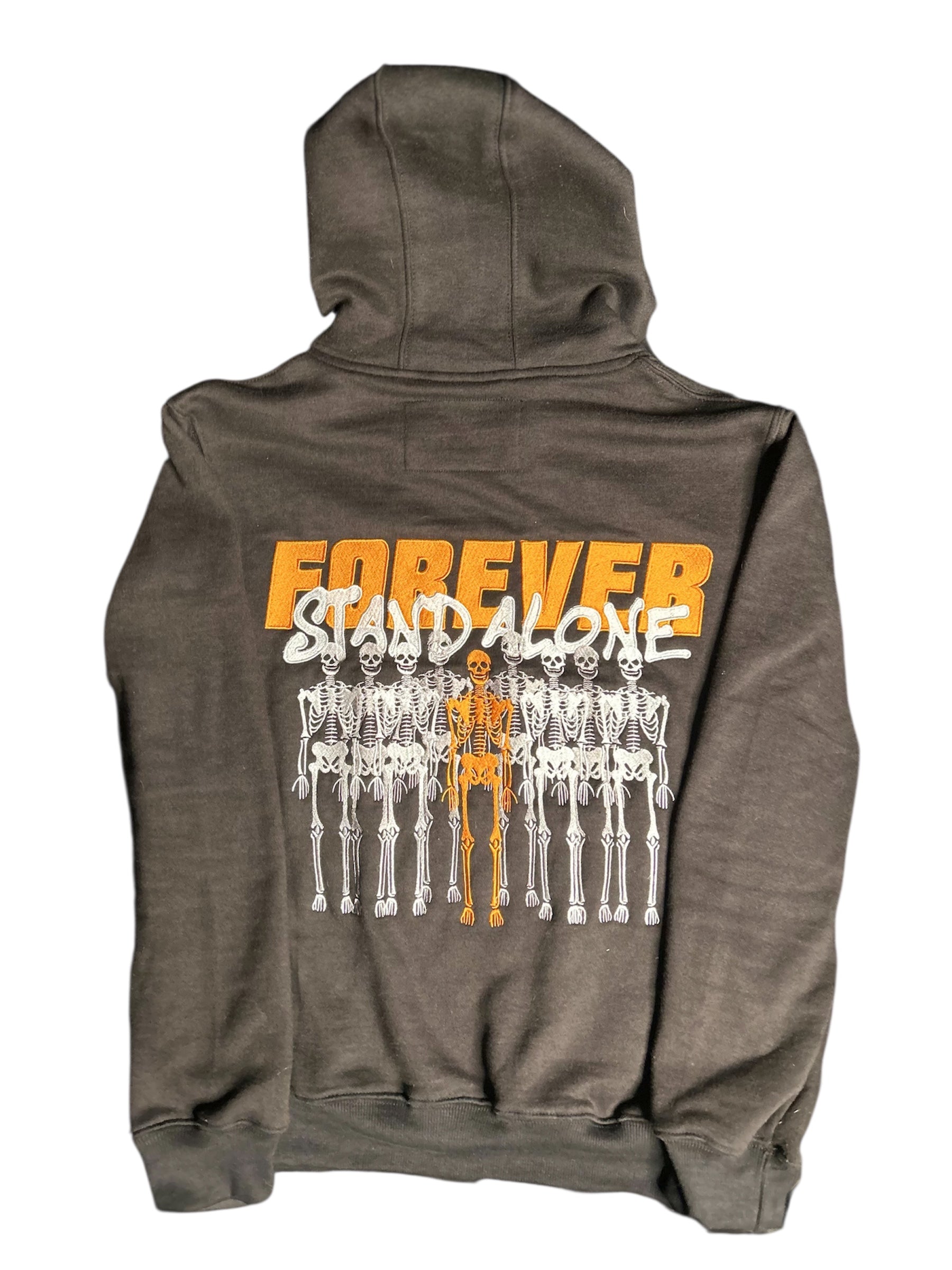 - Detailing: Skeleton standing alone on the front representing trust in yourself also there is a skeleton collage on the back seems like there in a group but still standing alone.